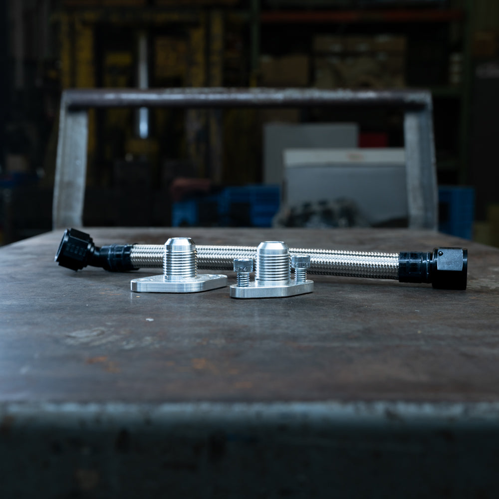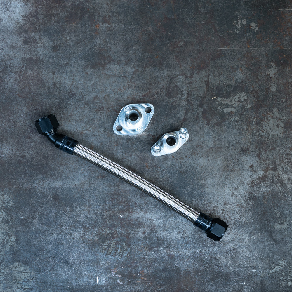 Kit includes billet turbo drain flange, block adapter, and stainless steel braided line